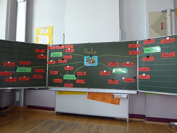 Die Mind Map wird von den Schülern ins Heft oder auf ein Zeichenblockpapier von der Tafel abgezeichnet. Als besonderen Anreiz bekommen die Kinder ein Foto von Paula und weitere bunt ausgedruckte Hundebilder. Damit können sie ihre Werke ausgestalten. Nachdem sie fertig sind folgt Schritt zwei.